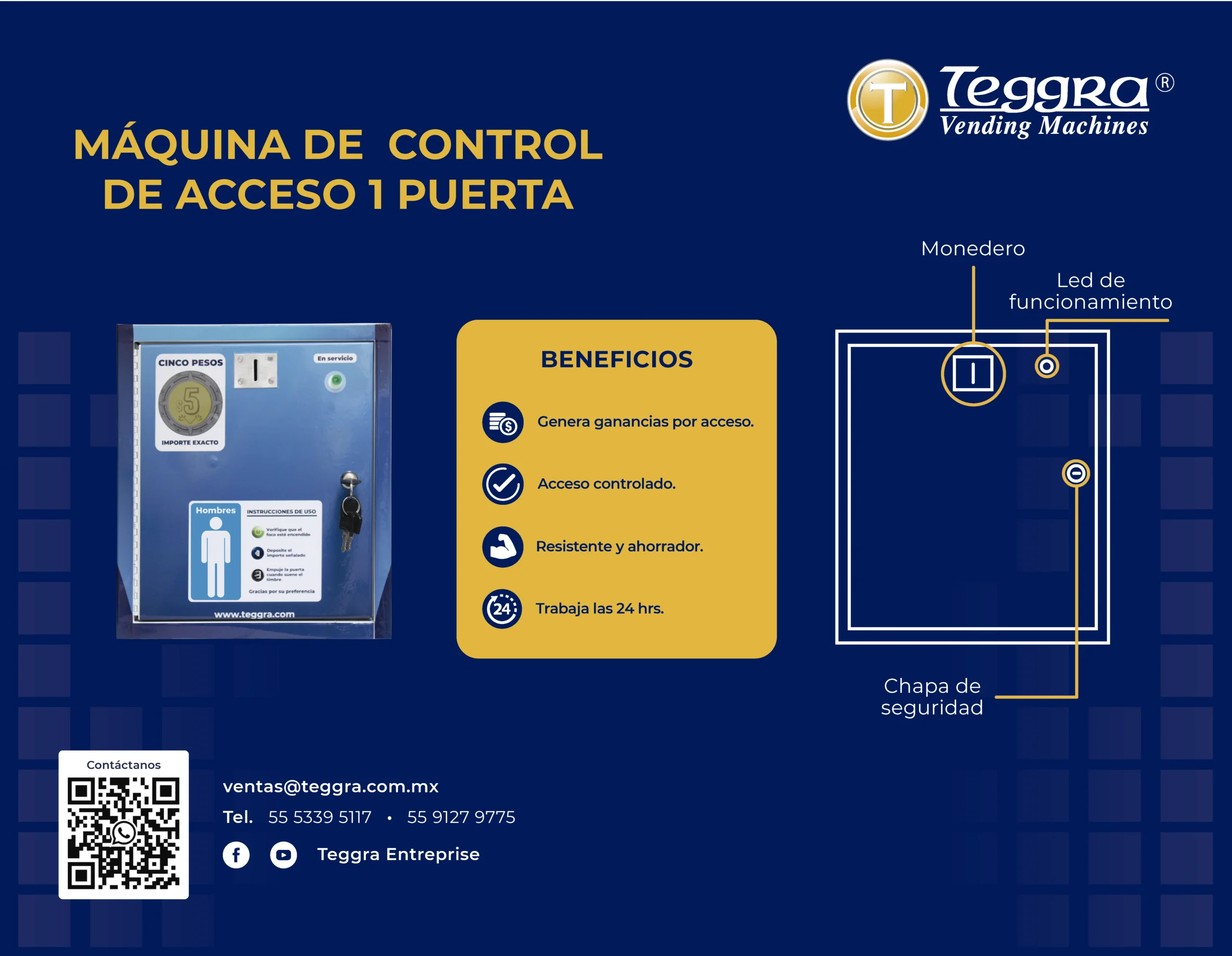 La máquina vending de Control de Acceso modelo “Sénior” es de uso rudo y posee las últimas innovaciones para su excelente rendimiento y control de una puerta. Su gabinete está hecho en lámina de metal y cuenta con una puerta empotrada que le garantiza una mayor solidez. Ideal para centros comerciales, Gasolineras, Terminales de autobuses, Mercados y muchos más lugares. Este equipo permite Generar ingresos, Control del usos de sus sanitarios y Evita desperdicio y/o mal uso de los mismos.