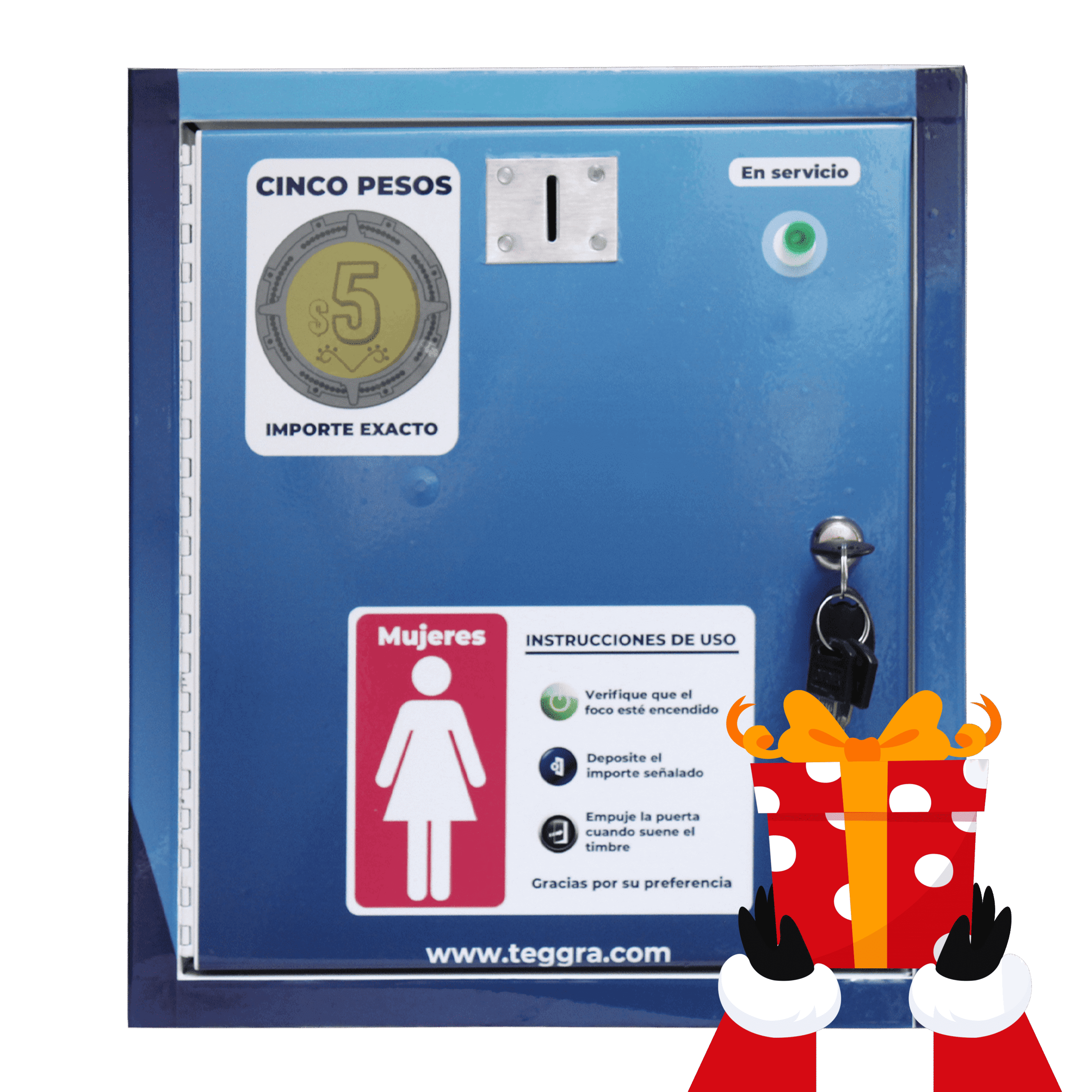 - Gabinete de lámina de acero calibre 18 y dos chapas de seguridad bancaria, una para la puerta y otra para la caja de monedas en lámina de acero calibre 20, ambas chapas con juego de 2 llaves.